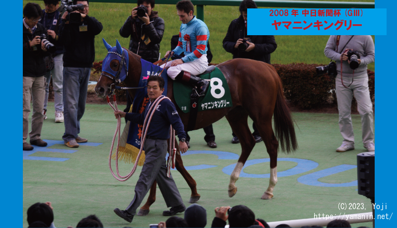 ここまで、札幌2歳S(G3)9着、朝日杯FS(GI)7着、きさらぎ賞(G3)3着、毎日杯(G3)4着、神戸新聞杯(G2)8着、菊花賞(GI)9着と実に6回重賞に挑戦してきたヤマニンキングリー。夢見たクラシックロードに一区切りをつけると、11月には東京・アンドロメダS(OP)で出直しを図り、1番人気で勝利を飾ると、いよいよ初タイトルを手にしようと挑戦したのが、2008年12月 第44回 中日新聞杯(G3)でした。武豊騎手から手綱を受け取ったデムーロ騎手を背に、ペースが落ちたレースのなかから決め脚鋭く抜け出して1着でゴール板を駆け抜けました。
